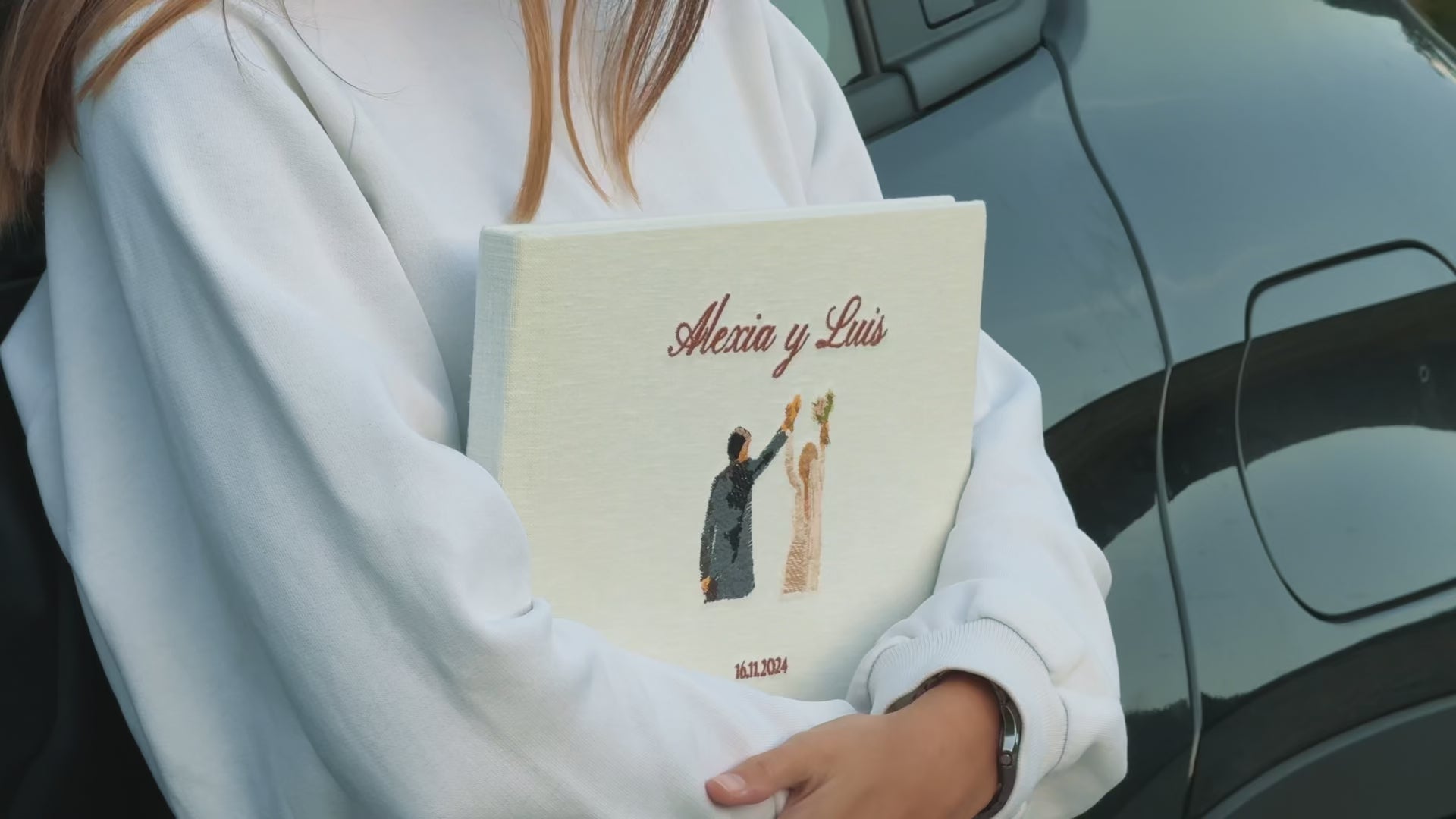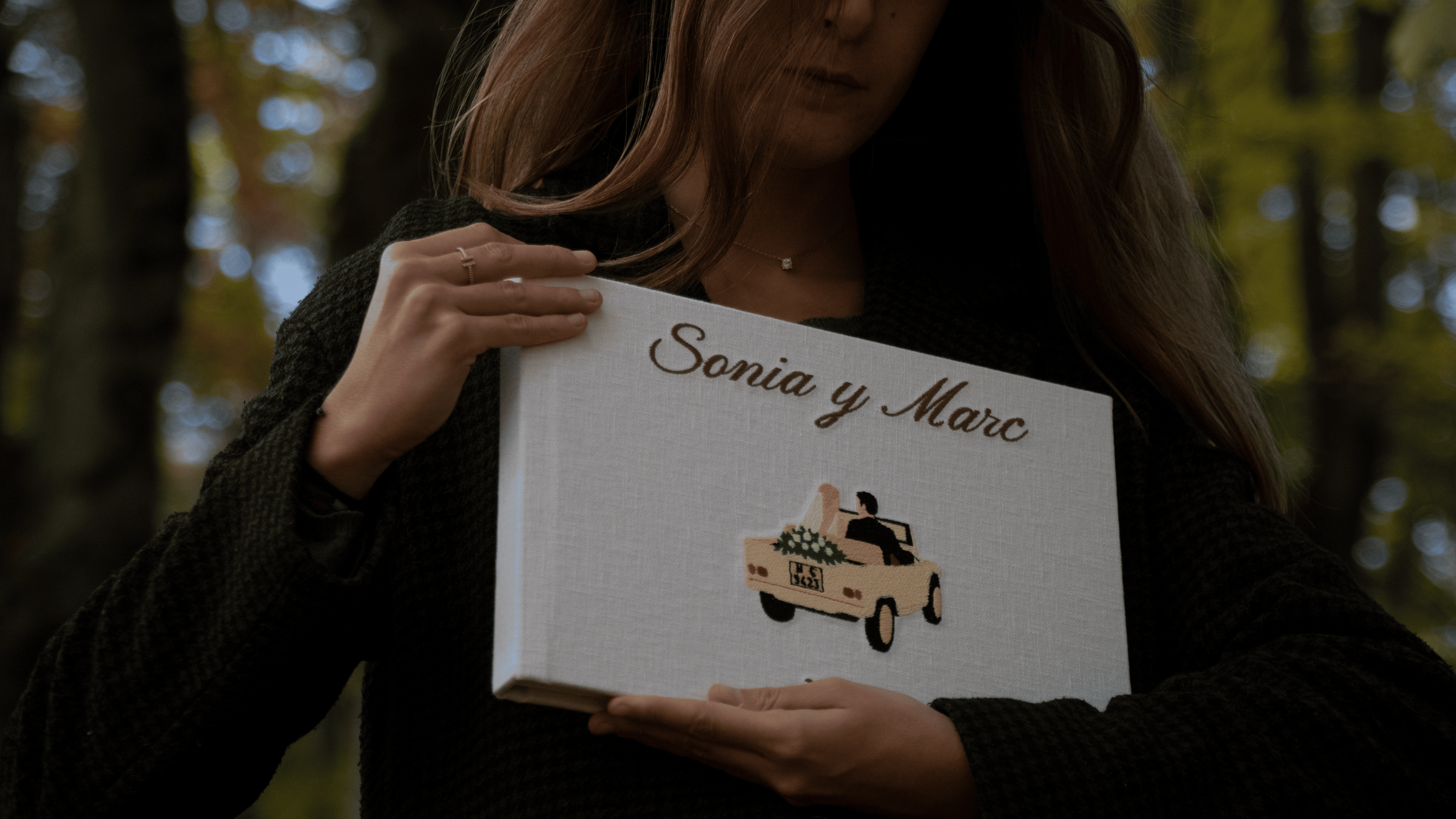 Está hecho con lino natural y bordado a mano, cuidando cada detalle para que refleje vuestra historia. En la portada se bordan vuestros nombres, la fecha de la boda y un pequeño dibujo inspirado en uno de los momentos más especiales del día.